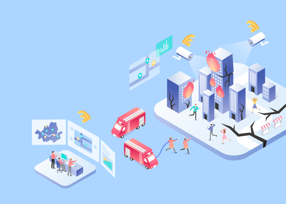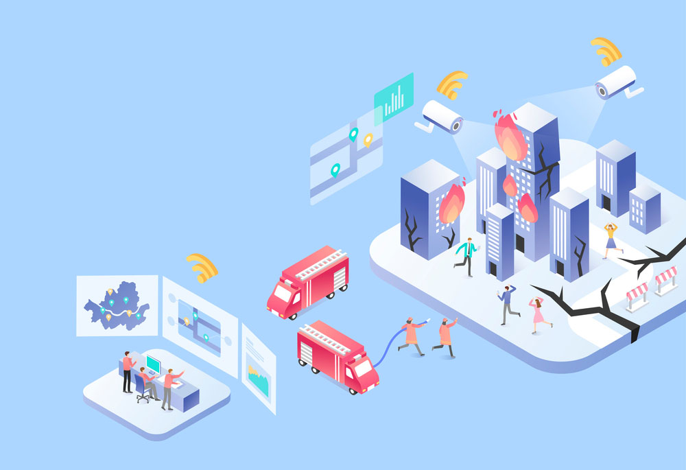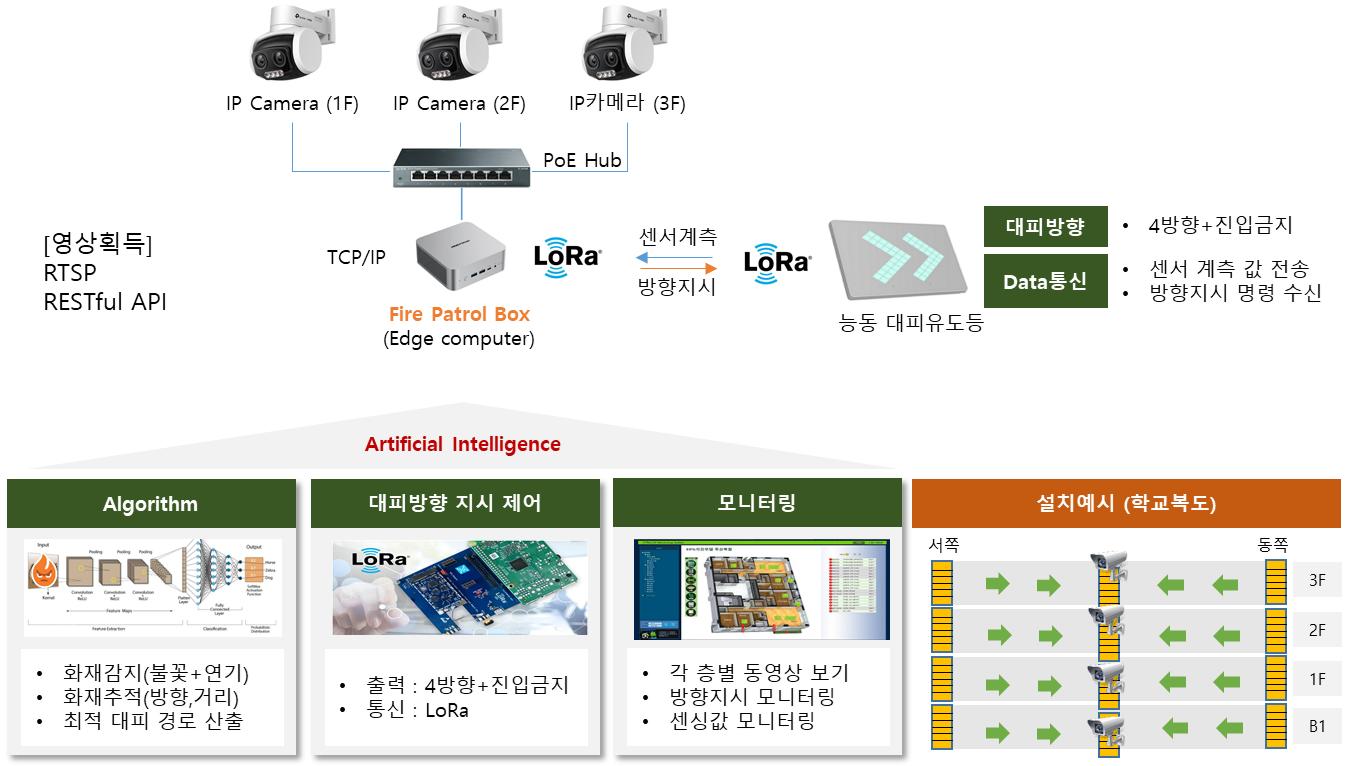 저 사양 IP카메라를 이용하여 영상을 수집하고, 저성능 엣지 컴퓨터에서 화재감시 모니터링 및 최적 대피 경로를 산출하여 비상대피 유도등에 방향을 능동적으로 지시함으로서 안전하게 탈출할 수 있는 『AIoT 기반의 보급형 화재 능동 대피 유도 시스템』